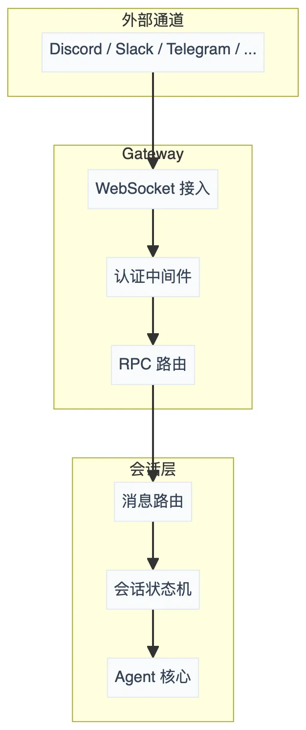 比如用户在 Discord 里发了一句话,到 Agent 回复,中间经过这些环节: