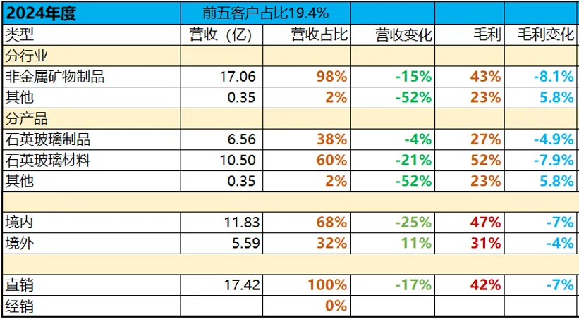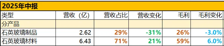 石英玻璃制品营收占比下降到了29%,营收下滑31%,毛利26%;