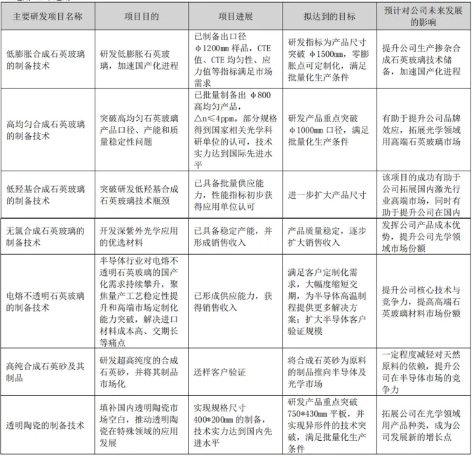 在石英玻璃材料和制品板块,高纯合成石英砂项目顺利转入中试阶段;