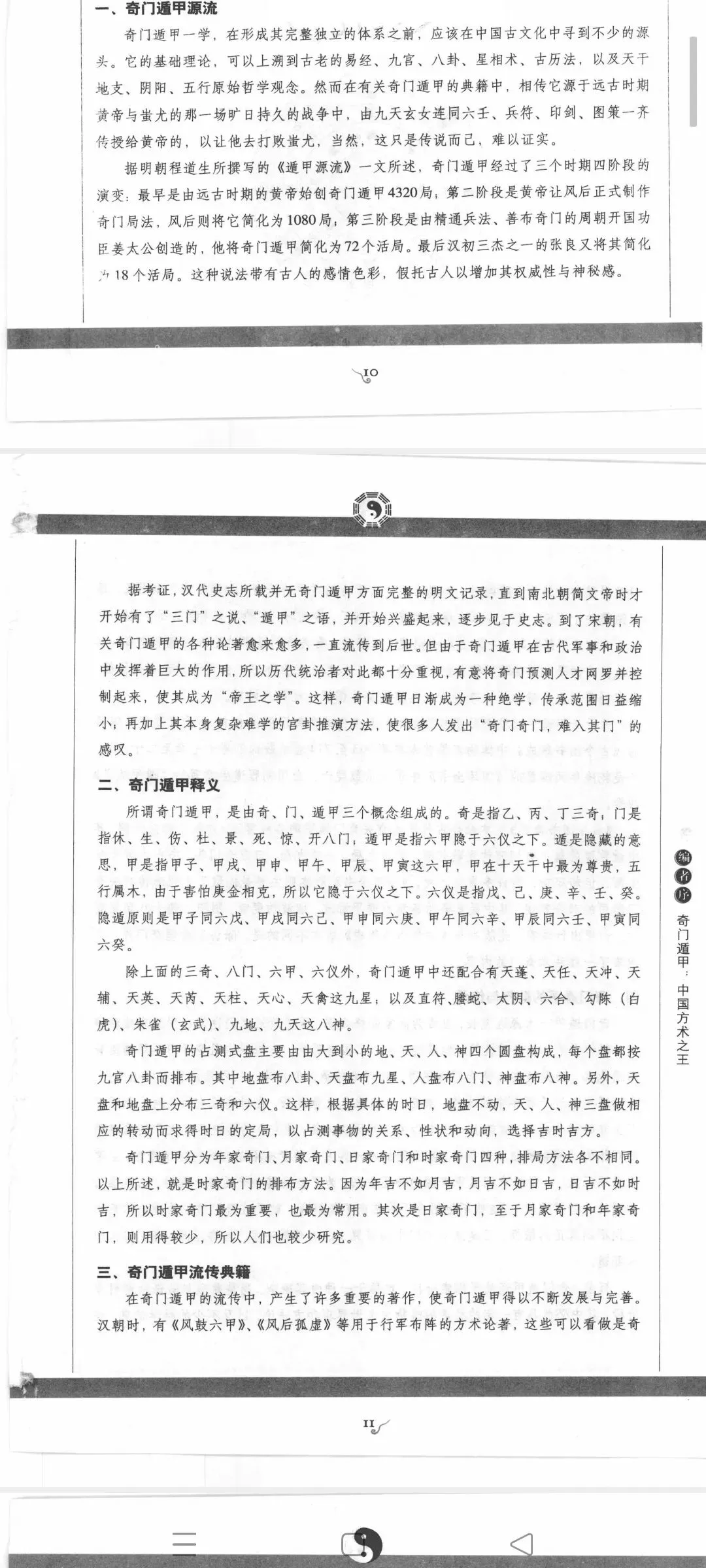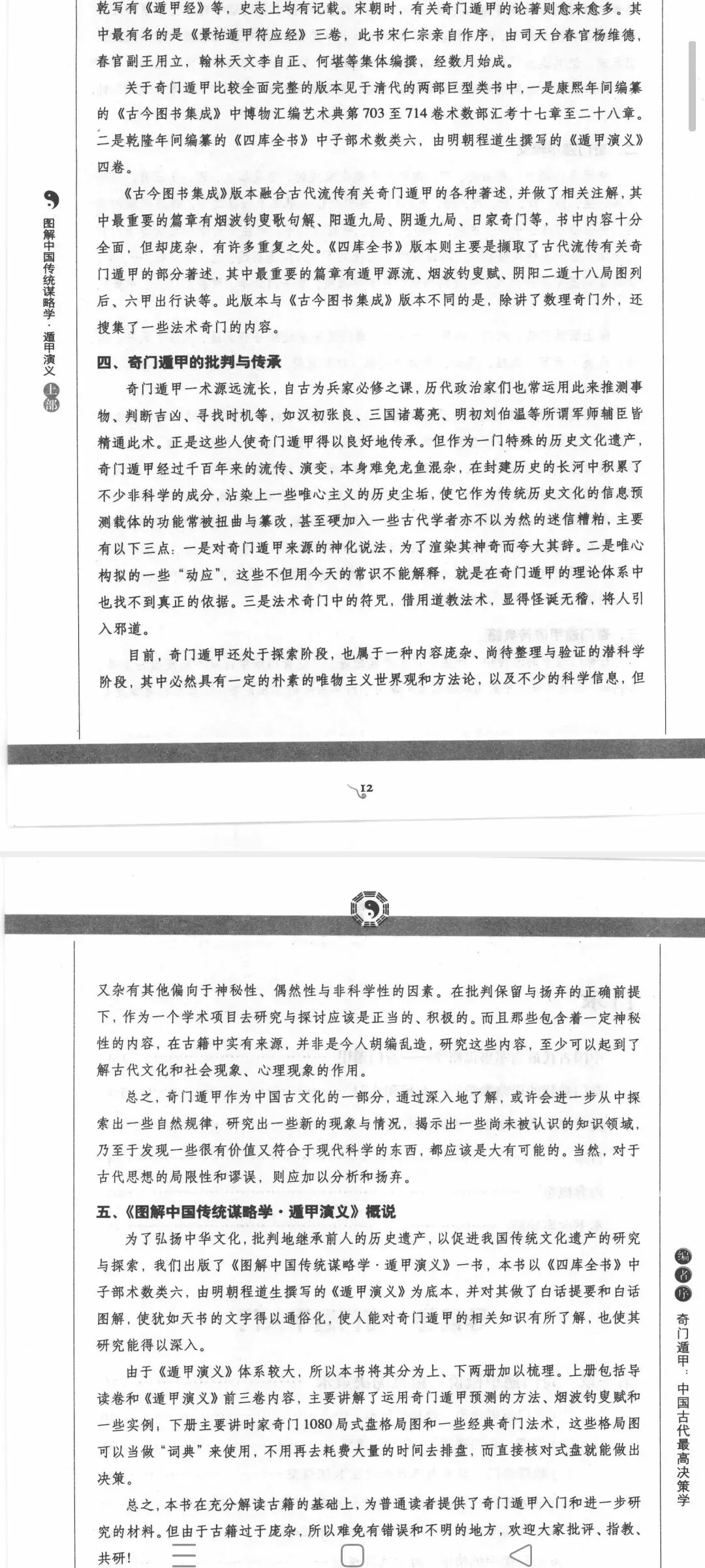 《遁甲演义》由明代程道生撰。道生字可生,浙江省海宁县人,生平不详。书中多引明代嘉靖、万历年号,最晚至万历四十二年(公元1613年),可见此书撰于明朝末年。清代收入《四库全书》,后有四库珍本印行。就《遁甲演义》书名的含义,可以推知其为敷陈奇门遁甲义理,并加以引申的术数著作。书中详述奇门遁甲之术,结合天文地理,阐述阴阳五行之道,对后世术数研究影响深远。