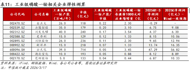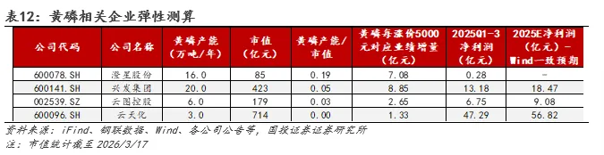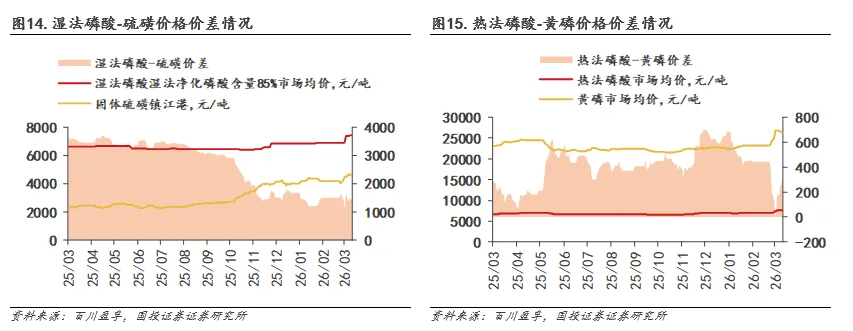 政策角度,2021年工信部发布《“十四五”工业绿色发展规划》,提及“严控尿素、磷铵、电石、烧碱、黄磷等行业新增产能,新建项目应实施产能等量或减量置换”;发改委等四部门发布《高耗能行业重点领域节能降碳改造升级实施指南(2022年版)》提出“到2025年,黄磷领域能效标杆水平以上产能比例达到30%,能效基准水平以下产能基本清零”;发改委发布《产业结构调整指导目录(2024年本)》则将单台产能5000吨/年以下黄磷生产装置列为淘汰类产能。我们认为,后续黄磷新增产能将受政策严格约束。需求角度,近期硫磺价格高企或将激活热法磷酸的短期替代需求,进而带动黄磷需求增长。截至2026年3月22日,我国硫磺价格4640元/吨,同比+97.45%(+2290元),以湿法磷酸硫磺单耗1.29吨计,湿法磷酸生产成本已同比上涨2954.1元。而热法磷酸一方面因核心原材料黄磷价格相对硫磺较稳定,另一方面其无需一步额外的净化步骤,可直接作为工业级磷酸使用,短期性价比或较突出,在用量增加预期下,后续有望带动原材料黄磷价格上行。