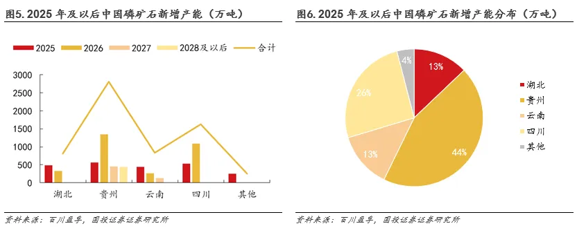 国内磷矿新增产能有限,磷矿石供应预计偏紧。据百川盈孚,2026年,我国磷矿石产能全年增量预计3000万吨,其中湖北增量330万吨,贵州增量1350万吨,四川增量1090万吨,主要是2024-2025年产能爬坡和2026年部分产能投产提供。展望后续,目前国内磷矿资源从审批到完全形成产能通常历时数年,每年投放额度也受到限制,预计磷矿石供应将长期维系偏紧态势。
