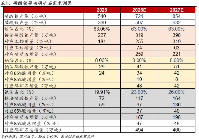 近期全球磷资源惜售情绪强化,我们认为,后续在三大方面可类比稀土的发展逻辑:①同时具备稀缺性与不可再生性;②产业链壁垒+行政管控把握定价权;③下游新兴领域需求正在实现跨越。供给层面,国内磷矿新增产能有限,国内磷矿资源从审批到完全形成产能通常历时数年,每年投放额度也受到限制,预计磷矿石供应将长期维系偏紧态势。需求层面,2026-2027年预计会成为下游磷酸铁产能装置投放的小高峰,2028-2030年后投放逐渐放缓,且预计铁法产能增量更明显。综合来看,2026-2027年,磷酸铁投产预计带动磷矿石需求增量494/460万吨,2026年预计紧平衡。
