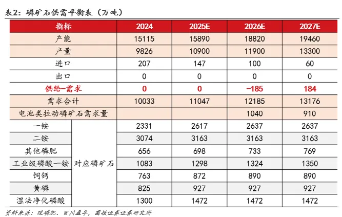 2026年预计磷矿紧平衡。需求端看,储能和动力电池需求预计拉动2026年磷酸铁需求100多万吨,其磷矿石单耗3.5-4吨,预计对应高品位磷矿约500万吨,对应原矿约1000万吨。后续进口100多万吨和磷矿枯竭100多万吨大体抵消,2026年预计紧平衡,至2027年新增产能进一步释放,景气或有所下滑。