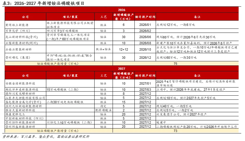 新能源下游产能投放节奏明确,有望驱动工业级磷酸一铵需求。随着新能源汽车和储能产业的爆发式增长,磷酸铁锂电池凭借其安全性高、循环寿命长、成本较低等优势,逐步取代三元锂电池。2025年磷酸铁锂电池在动力领域装车量占比高达81.5%,在储能领域渗透率超过99%。而磷酸铁作为锂离子电池正极材料核心前驱体,直接决定着磷酸铁锂电池的性能、成本和安全性,其中铵法是当前磷酸铁最主要的制备方法。据隆众资讯,截至2025年,磷酸铁的铵法产能占比超60%。而工业级磷酸一铵是铵法制磷酸铁的关键原材料,单耗约0.8吨,其需求与磷酸铁产能扩张深度绑定,有望伴随新能源汽车和储能的进一步发展加速释放需求。据隆众资讯和百川盈孚,2026-2027年仍有较多磷酸铁项目投产,其中2026年磷酸铁铵法产能增量75万吨、2027年磷酸铁铵法产能增量73万吨。新能源领域较为明确的产能投放节奏,有望成为拉动工业级磷酸一铵消费持续增长的最主要动力。