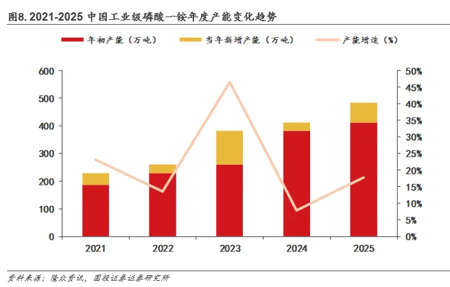 前期工业级磷酸一铵供应压力较大。2021至2025年,工业级磷酸一铵行业总产能从229万吨增长至484万吨,CAGR达20.57%;产量由115万吨提升至300万吨,CAGR为20.58%,但由于有效需求未能同步跟进,行业平均产能利用率长期在48%-65%的区间内承压徘徊。具体来看,2021年受磷酸铁锂需求爆发驱动,年内新增产能43万吨,同比+23%;2022年,在长江经济带治理、磷石膏“以渣定产”等环保政策收紧以及外部经济环境影响下,产能扩张节奏放缓;2023年,基于对新能源需求前景的乐观判断,企业再度大幅扩产;至2024年,产能增速已显著回落至低位,全年新增仅30万吨;进入2025年,随着新能源需求回暖和产业链一体化程度加深,产能增速回升至18%,但环保与资源约束持续,产能进一步向拥有磷矿资源和成本优势的头部企业集中,行业竞争格局趋于优化。