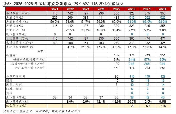2021-2025年,工铵总产能从229万吨增长至484万吨,CAGR达20.57%;但由于有效需求未能同步跟进,行业产能利用率长期在48%-65%区间承压运行。此后扩产节奏将显著放缓,2028年前预计新增三套装置,合计产能38万吨。此后尚无明确的新建项目规划,行业发展重心有望由规模扩张转向结构优化与效率提升。需求侧,磷酸铁是磷酸铁锂电池正极材料核心前驱体,2025年磷酸铁的铵法产能占比超70%,而工铵是铵法制磷酸铁的关键原材料,单耗约0.8吨,其需求与磷酸铁产能扩张相关性强。2026-2027年仍有较多磷酸铁项目投产,其中2026年磷酸铁铵法产能增量75万吨、2027年磷酸铁铵法产能增量73万吨。新能源领域较为明确的产能投放节奏,有望成为拉动工铵消费持续增长的最主要动力,2026-2028年工业级磷酸一铵有望分别形成-29/-69/-116万吨供需缺口,工铵后续有望演变为具备强资源属性与高景气持续性的关键战略原料,价格中枢有望获得坚实支撑。