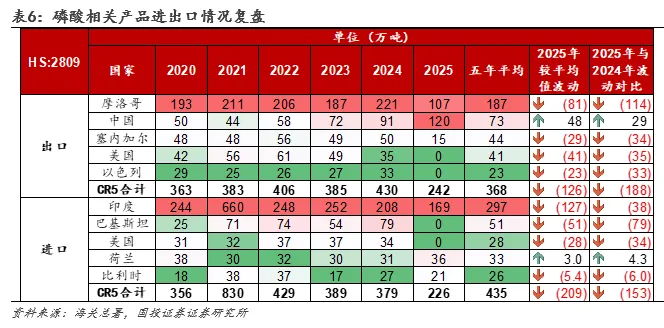 ①据海关总署数据,2025年国际贸易流中,HS2809(磷酸相关产品)摩洛哥出口量仅为107万吨,同比骤降114万吨,其余主要出口国亦普遍下滑,美国和以色列出口量近乎归零,而中国2025年出口量达到120万吨,同比2024年逆势增长29万吨,或反映中国磷酸产品正在填补全球供应缺口。