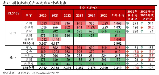 ②HS3105(磷复肥相关产品)方面,中国2025年出口量达1329万吨,同比大幅增长344万吨,远超近五年均值(1058万吨)。我们认为,中国磷复肥出口展现了显著“强者恒强”特征,在经历了几年的出口配额或政策波动后,在全球粮食安全保障中的地位依然难以替代。其他国家中,摩洛哥出口量维持在1200万吨以上的高位,虽同比微降,但仍是全球核心供应方。沙特出口量则连续五年阶梯式上升,2025年达649万吨,成为中国和摩洛哥之外重要的边际变量之一;俄罗斯与美国则已没有相关产品出口迹象。