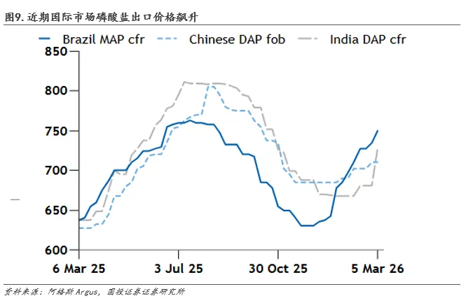 美伊冲突持续演绎,短期海外磷价高位难解。受美伊冲突影响当前霍尔木兹海峡通航基本停滞,核心原料硫磺的国际到岸成本价格已达4300元以上。同时,航运成本急剧攀升,船只被迫绕行好望角,航程增加15至20天,航运保险费暴涨300%以上,短期海外磷价高位难解。据农资市场与官微,摩洛哥磷酸二铵离岸价已达704美元/吨,沙特为684美元/吨。美国新奥尔良进口枢纽的化肥价格在一周内从每吨516美元跳涨至683美元;据阿格斯Argus,截至3月5日,俄罗斯磷酸一铵/二铵对南锥体地区国家的出口价格,已比上周高端价格更高50-55美元/吨;埃及国家商品进出口公司最新招标显示,磷酸二铵和重过磷酸钙的谈判价格,分别比上一轮招标的最高中标价至少高出30美元/吨和15美元/吨,或均反映当前海外磷价上行压力显著。