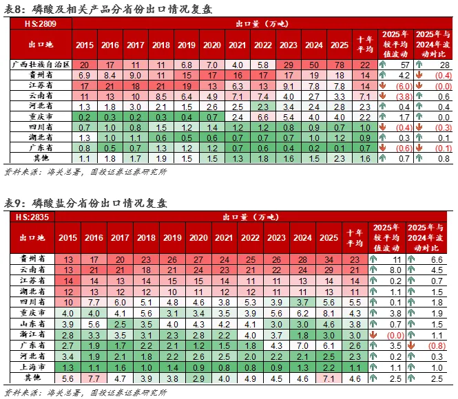 成本优势持续深化,关注广西+贵州的战略地位。从具体省份来看,HS2809(磷酸及相关产品)主要出口增量来自广西壮族自治区,HS2835(磷酸盐)主要出口增量来自贵州省和云南省。我们认为或主要系:①贵州是中国磷矿资源最丰富的省份,上游资源保障和一体化产业链加持下,其成本优势和供应稳定性突出;②广西本身并非传统磷矿主产区,但具备区位优势,贵州、云南等内陆省份的磷产品可通过铁路便捷运至广西港口(如钦州港、防城港)出口,形成战略出海口;③广西近年来布局了大型湿法磷酸及净化磷酸项目,或可利用其港口优势进口硫磺等原料,深加工高附加值产品直接出口,带动相关磷产品的出口提升。
