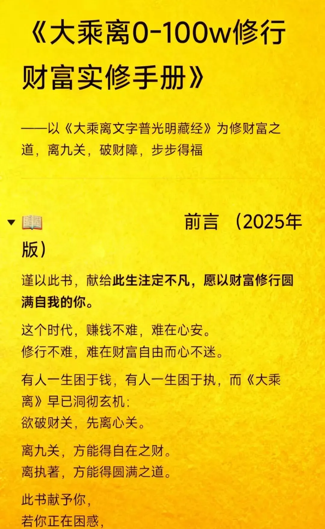 此手册不教投机,不教歪道,只教你如何借大乘离之力,转心修行,得财自在。财富即修行,修行即财富。离了九关,方入财道。
