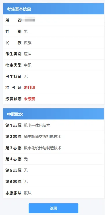 在平台首页上选择“报名志愿信息”,可以获取到考生报考的基本信息,包括报名信息、志愿信息。