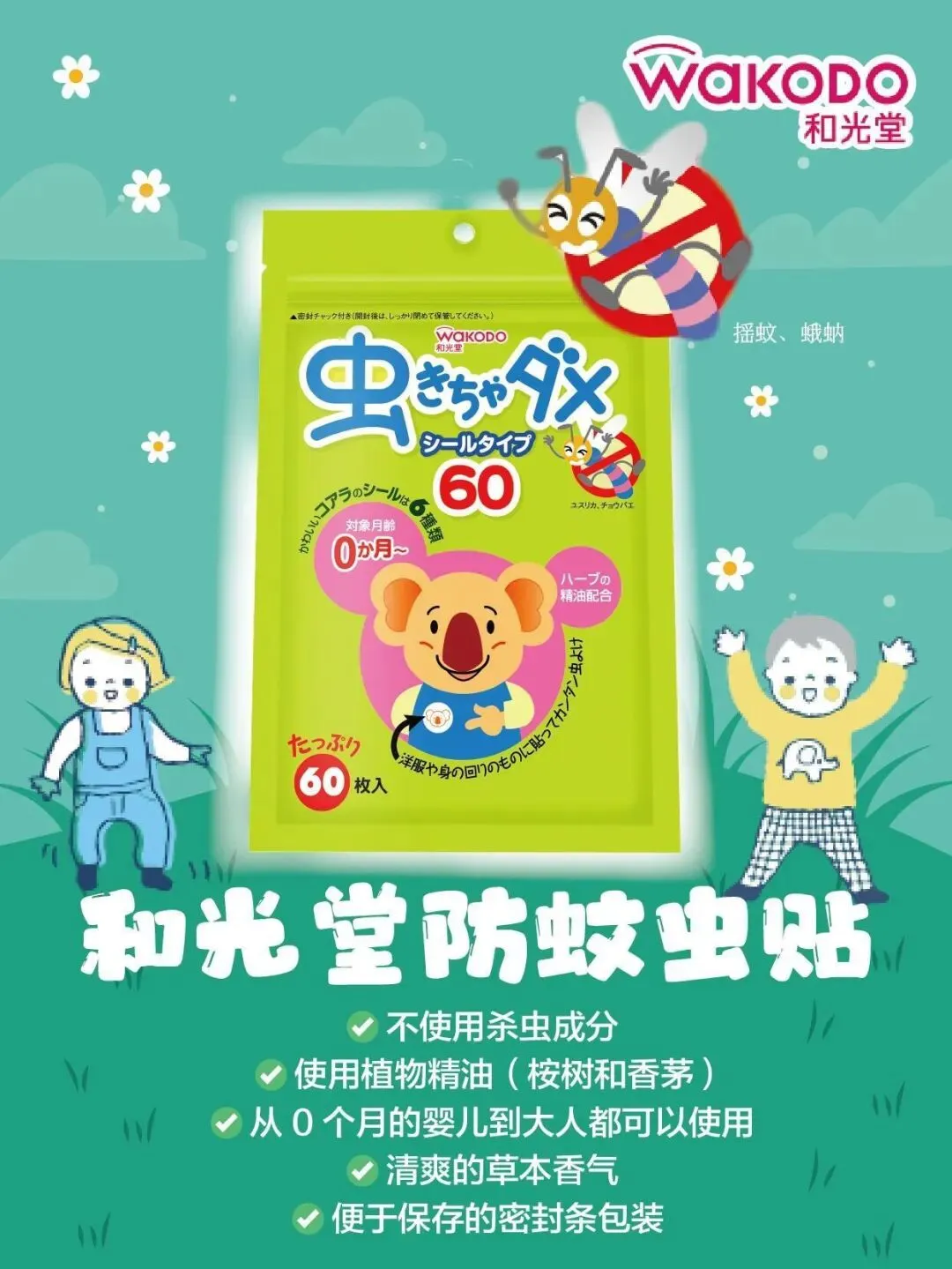 【WAKODO和光堂】驱蚊贴● 不使用杀虫成分!使用具有防虫效果的植物精油(桉树和香茅)● 从0个月的婴儿到大人都可以使用!● 无需直接涂抹于肌肤即可防虫!● 清爽的草本香气● 效果持续6~8小时 ※ 因使用环境而异● 便于保存的封条包装 !