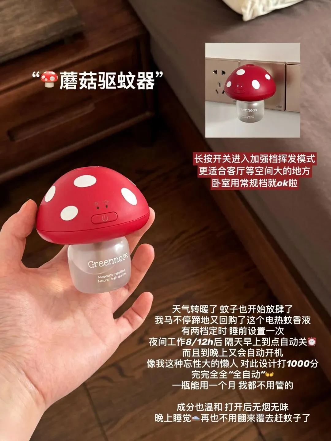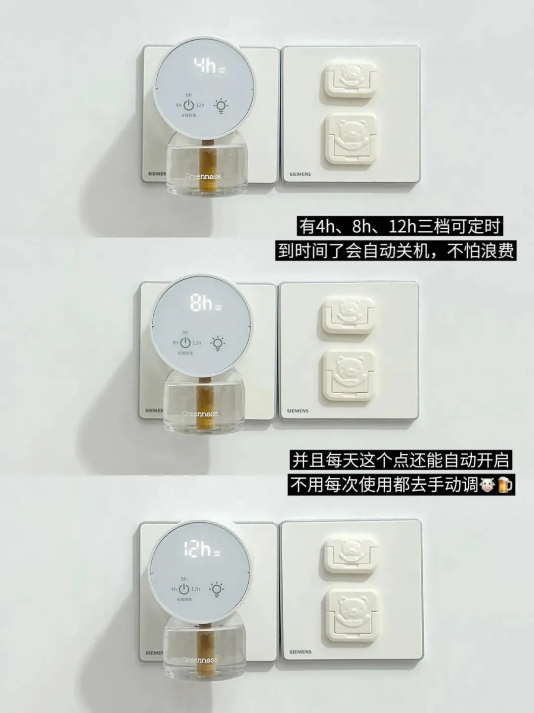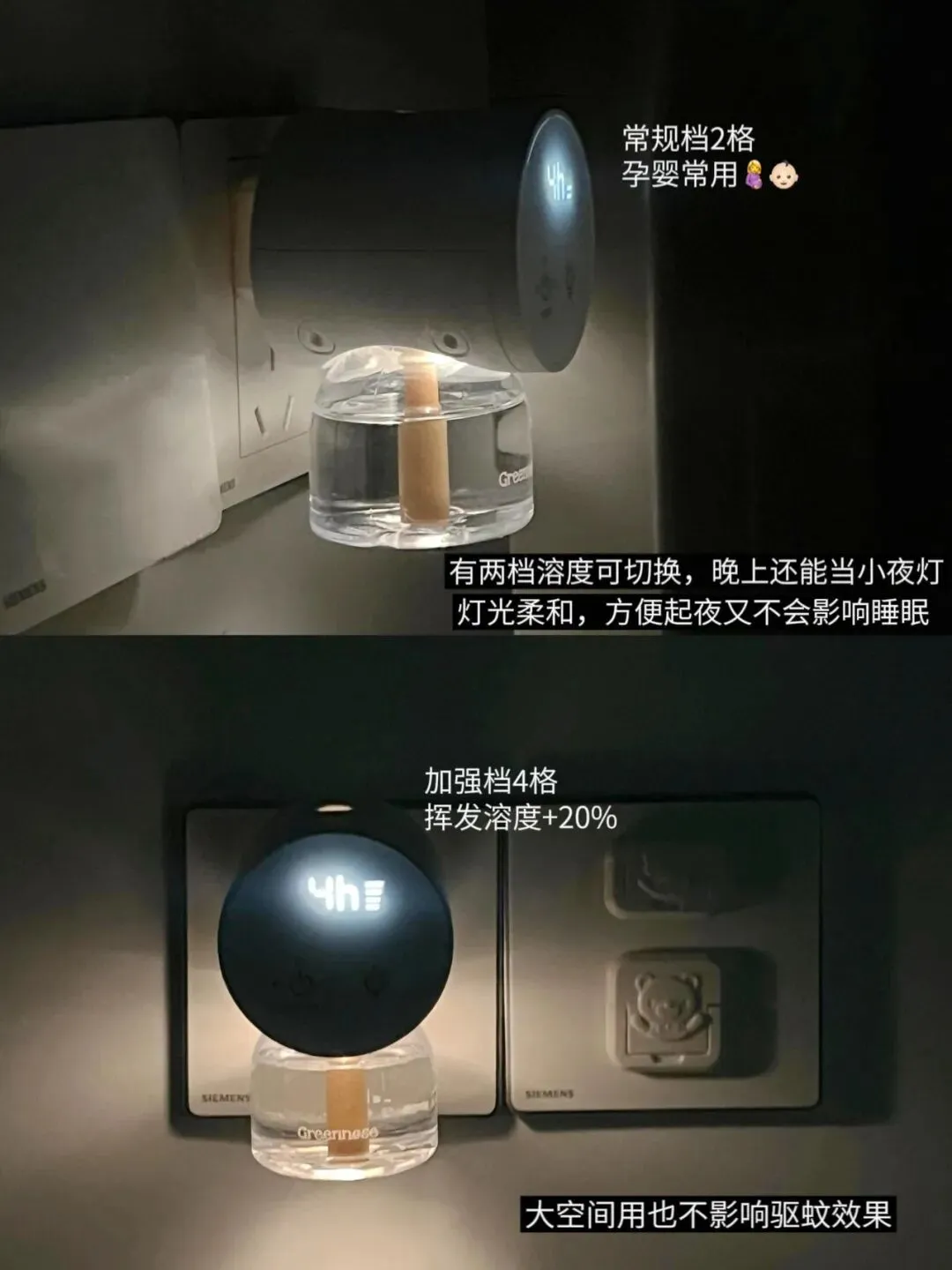 【绿鼻子 新升级三代PLUS 电蚊香】有4h、8h、12h三档可以定时,到时间会自动关机不会造成浪费,而且不用每次都去设置定时1次就行,每天这个点还会自动开启还升级了可调溶度像白天在客厅用的时候就会切换增强档模式挥发溶度增加20%,大空间驱蚊效果也是扛扛的!