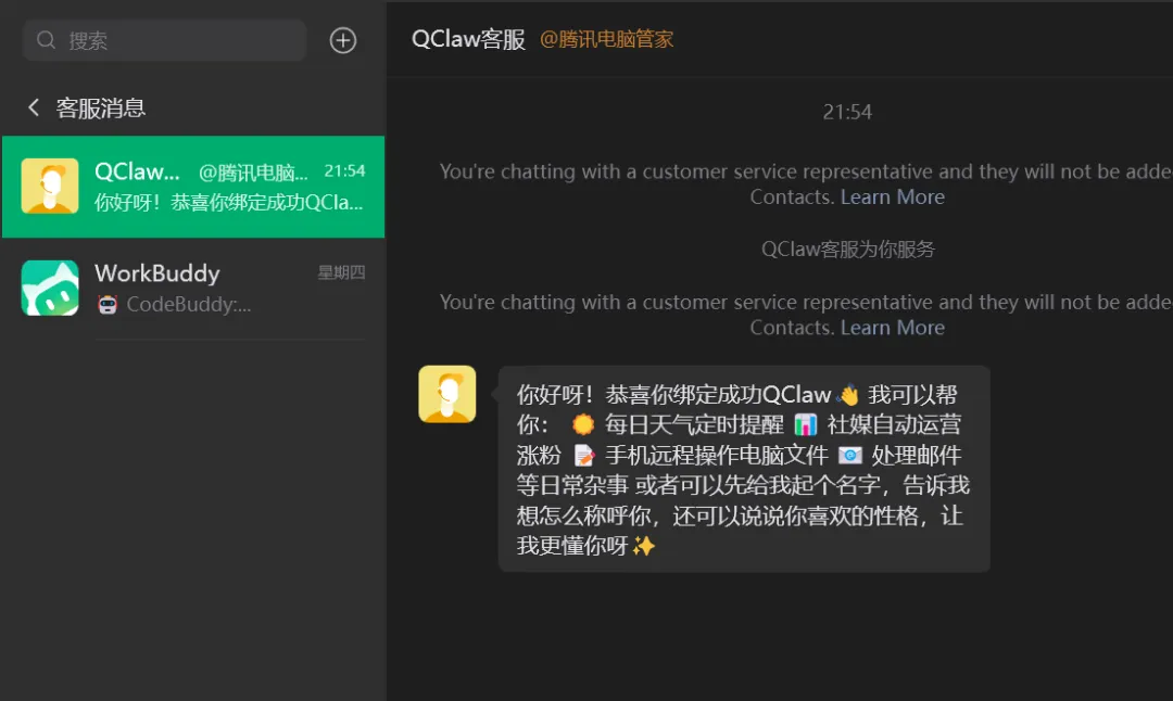 安装完成后输入邀请码,按照提示完成微信绑定,很快就收到了QClaw客服号的绑定成功通知,整个流程顺畅无卡顿,几分钟便完成了全部准备工作,即便小白用户也能轻松上手。