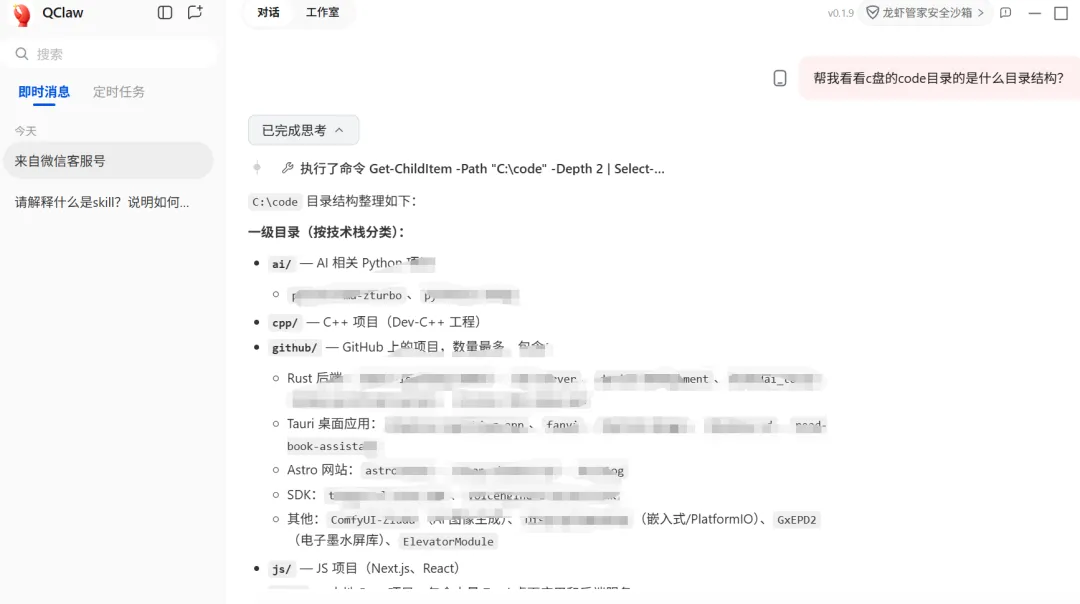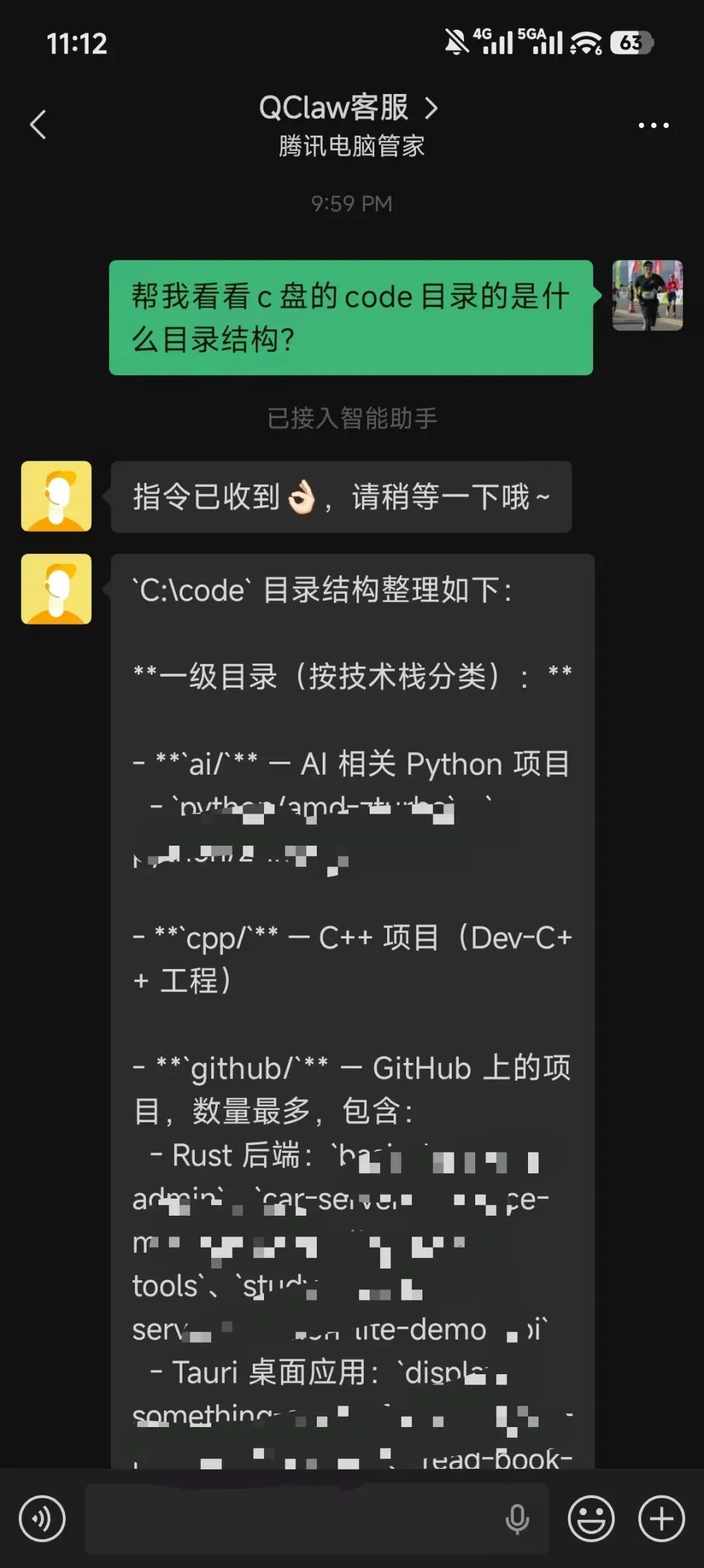 远程查看目录:手机发送指令后,QClaw能快速响应,准确列出电脑上的所有目录结构,清晰直观,为远程操控打下基础;