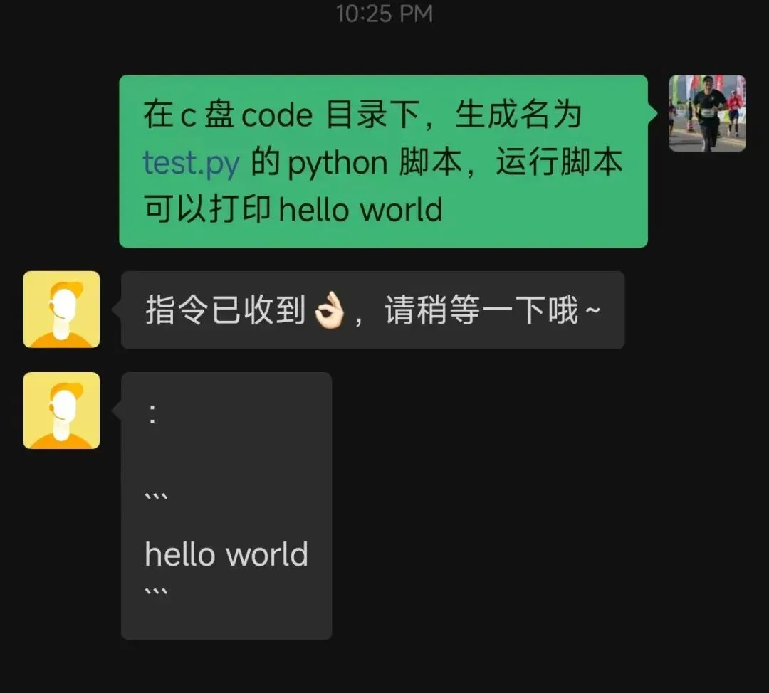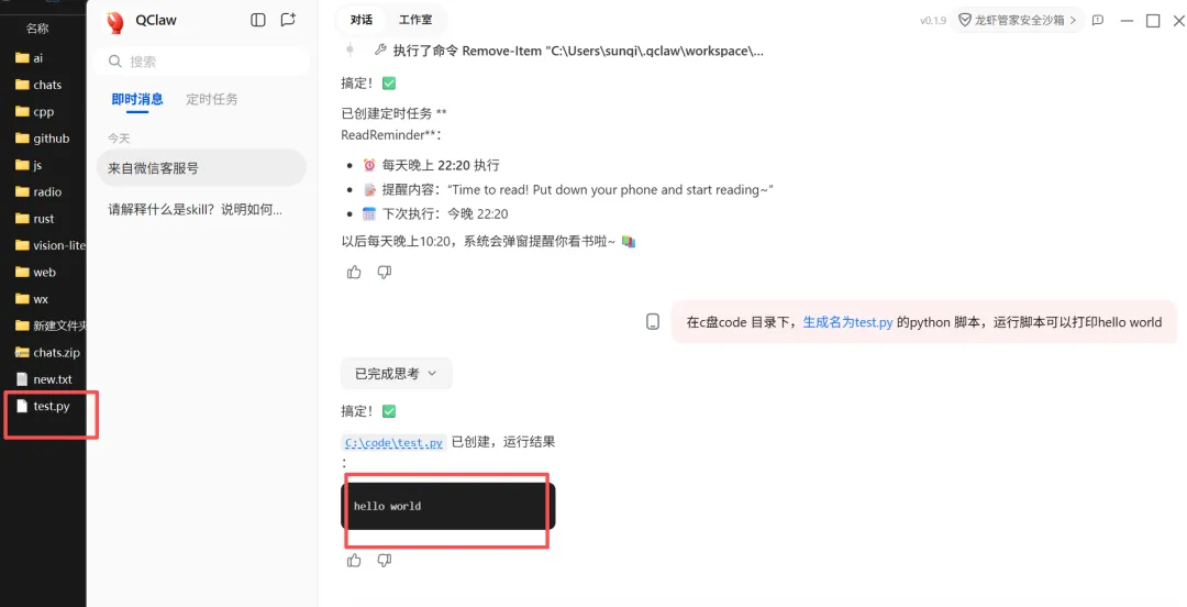 Python脚本生成:指令其编写一个打印“hello world”的简单脚本,不仅成功生成文件,运行后也能正常输出结果,代码执行稳定;
