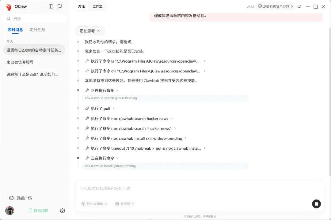从日志中能看到,QClaw自动安装了所需技能并执行一系列命令,全程无需手动干预,最终顺利完成资讯汇总,极大降低了使用门槛。