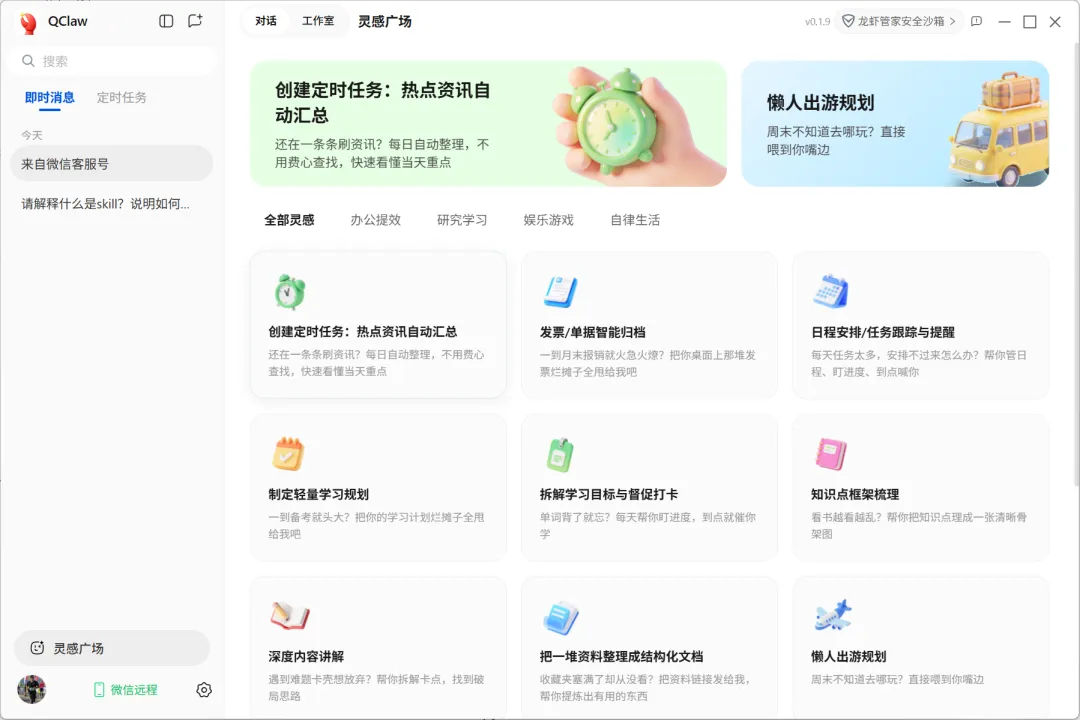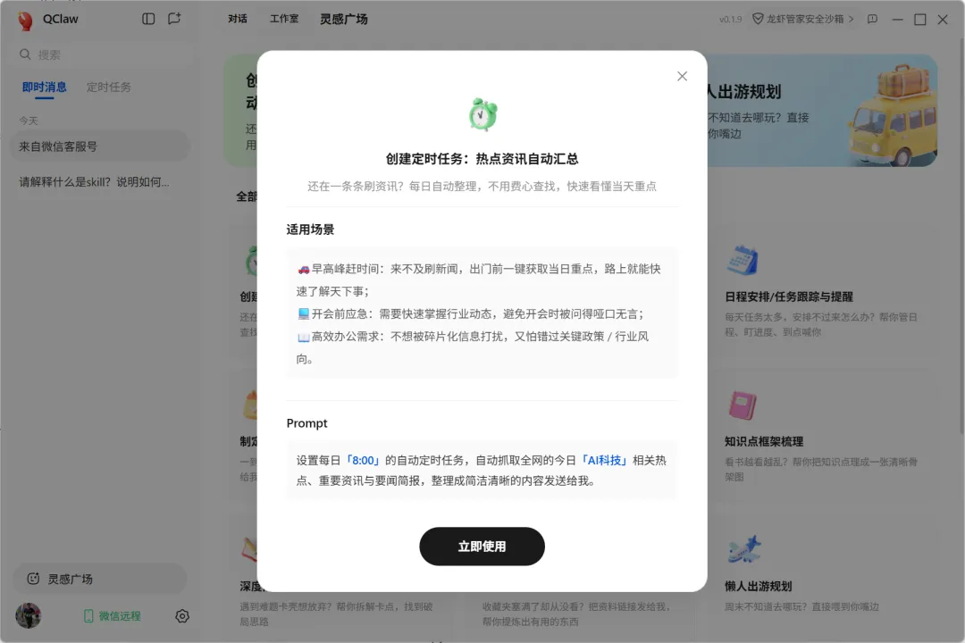 在QClaw界面左下角,意外发现了“灵感广场”功能——这是其近期版本更新的重点功能,里面预置了多款实用任务模板,涵盖办公提效、资讯汇总等多个场景,无需手动编写指令,点击即可立即使用。