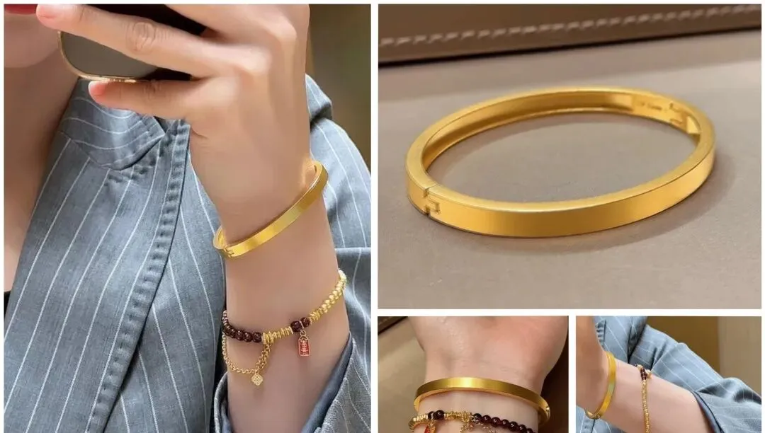 说到叠戴 这真的是最近两年特别火的戴法 以前大家都觉得黄金手镯只能单戴 戴多了像暴发户 但现在不一样了 细款的手镯就是为叠戴设计的 两只三只一起戴 再配个珠串或者皮绳 层次感立刻就出来了 我有个朋友 她一只手上戴了四只细镯子 两只光面两只刻花 还搭了一串黑玛瑙 整个人气质都变了 关键是这样戴不会显得俗气 反而很有设计感 年轻时尚