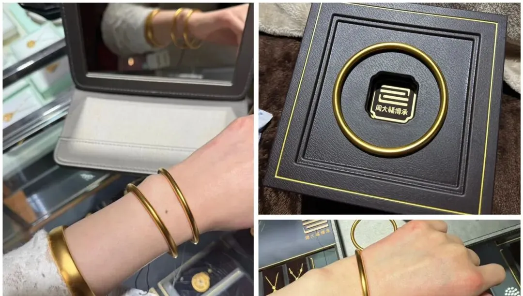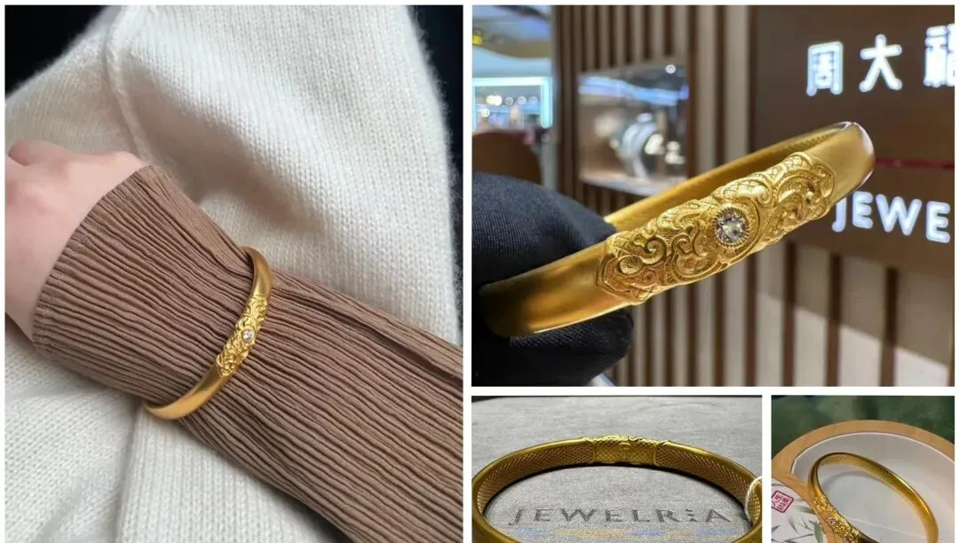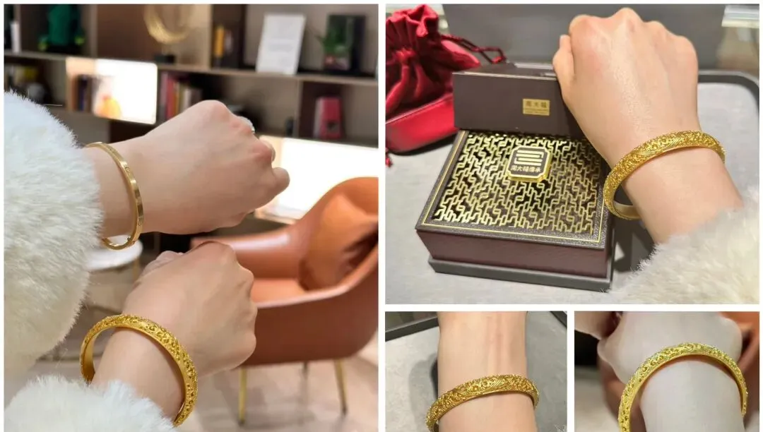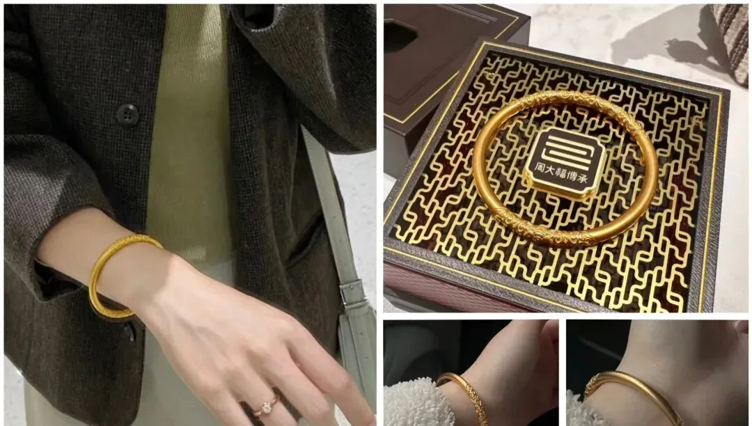 说起来我自己也是最近才入了几只周大福的手镯 之前总觉得黄金首饰是妈妈辈的东西 年轻人戴太土气 但现在你去商场看看 满眼都是二十来岁的姑娘在柜台前挑手镯 款式也完全不一样了 光面的 刻花的 磨砂的 细的能叠三四只 粗的单戴就很有气场 我买的这几只里面 有一只是传承系列的 表面压了满满的花纹 灯光下转个手腕就闪 搭配灰蓝色衬衫特别显气质 另外还有一只素圈的 简简单单一个圆 戴着最舒服 也最百搭