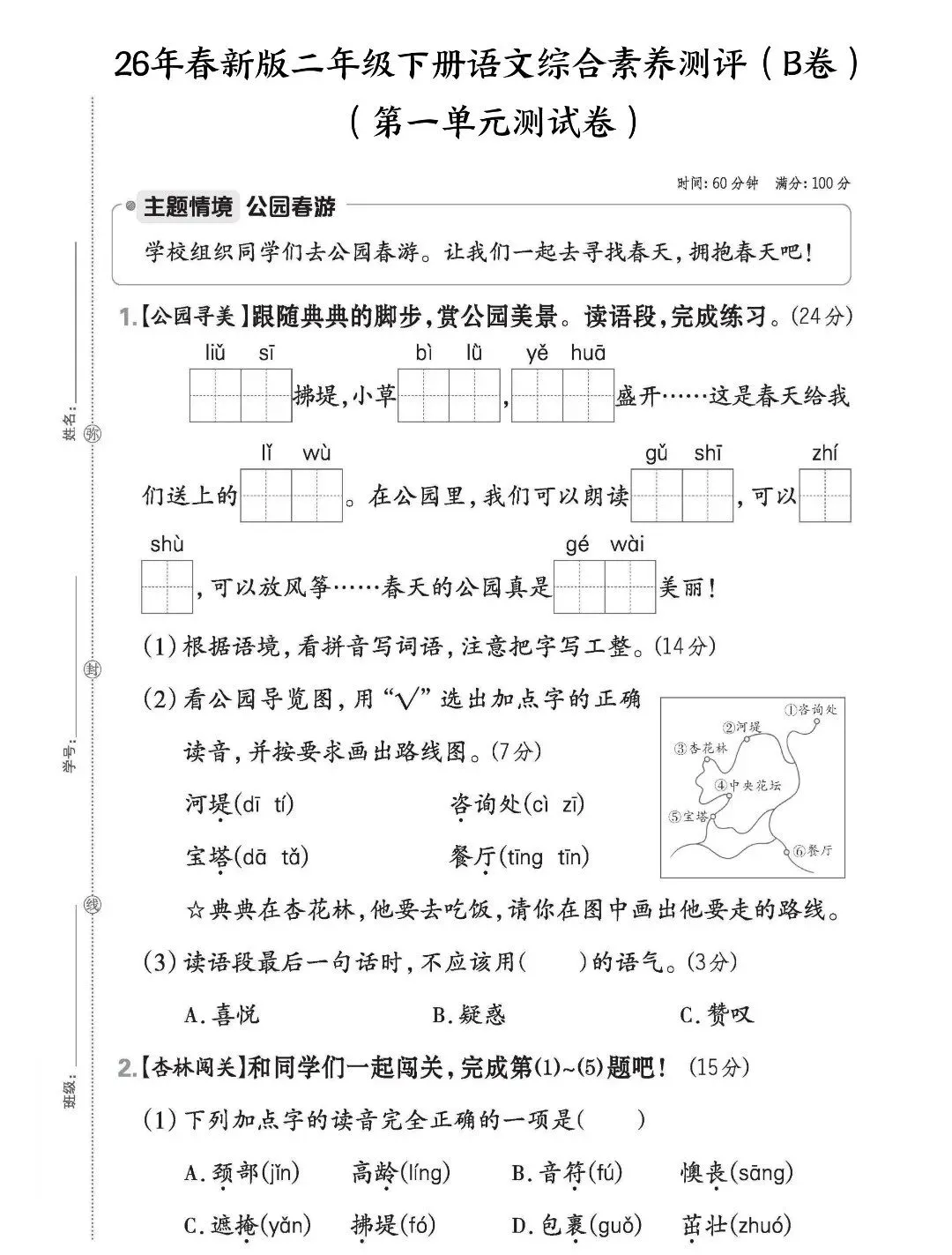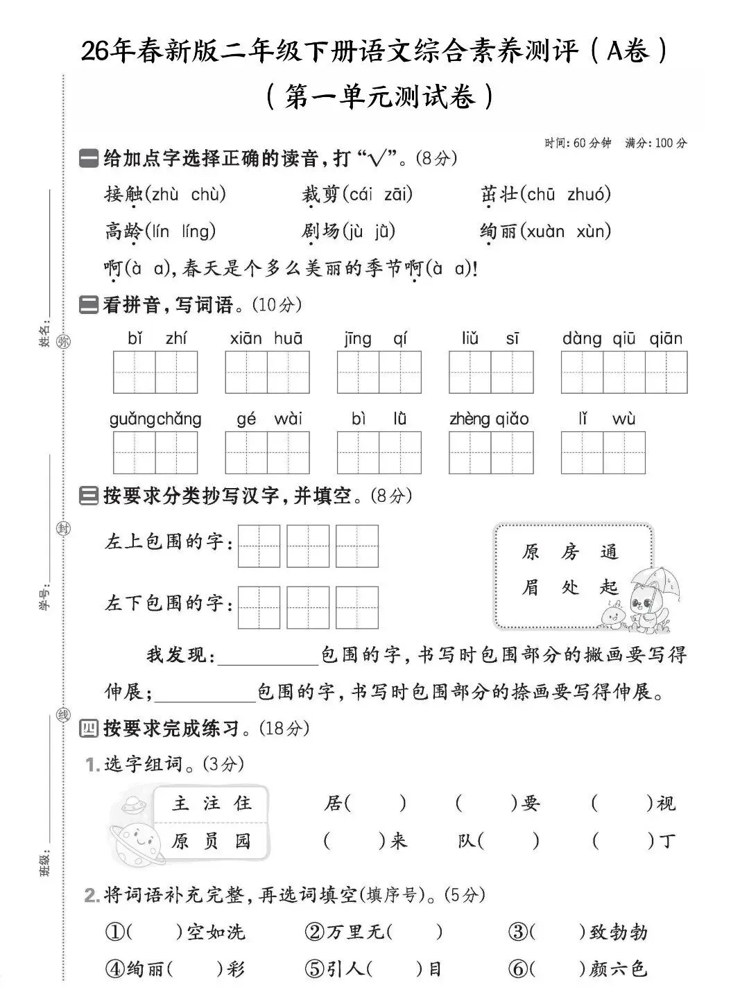 26年人教新版二年级下册语文第一单元测试卷,含答案共5套,电子版可打印可下载,这份二下语文第一单元检测卷,精准覆盖了课本第一单元中的重点知识点,让孩子清楚自己的薄弱环节,及时查漏补缺,提升语文学习效率。需要的家长打印出来,让孩子练一练吧!