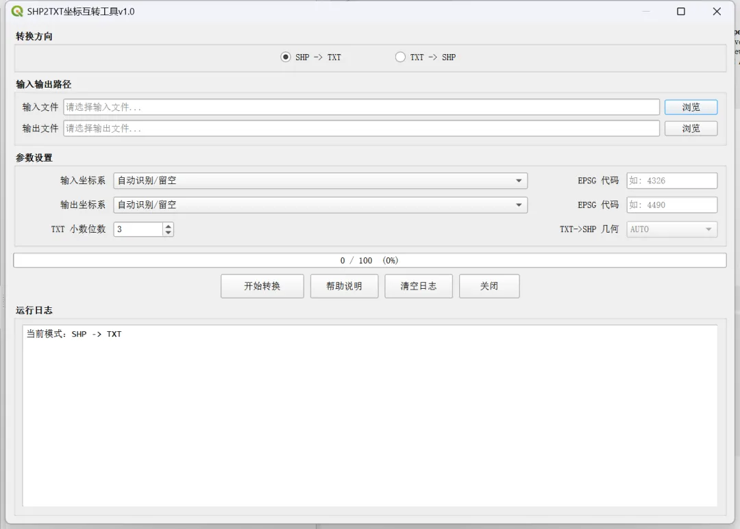 打开工具后,首先选择转换方向,再依次指定输入文件与输出文件路径,从下拉列表中选择输入坐标系与输出坐标系,如需使用列表以外的坐标系可选择”自定义”后手动填写 EPSG 代码。SHP 转 TXT 时可设置坐标小数位数;TXT 转 SHP 时可指定输出几何类型或保持 AUTO 自动识别。参数确认后点击”开始转换”,转换过程中的提示信息会实时显示在运行日志区域,转换完成后弹窗提示。