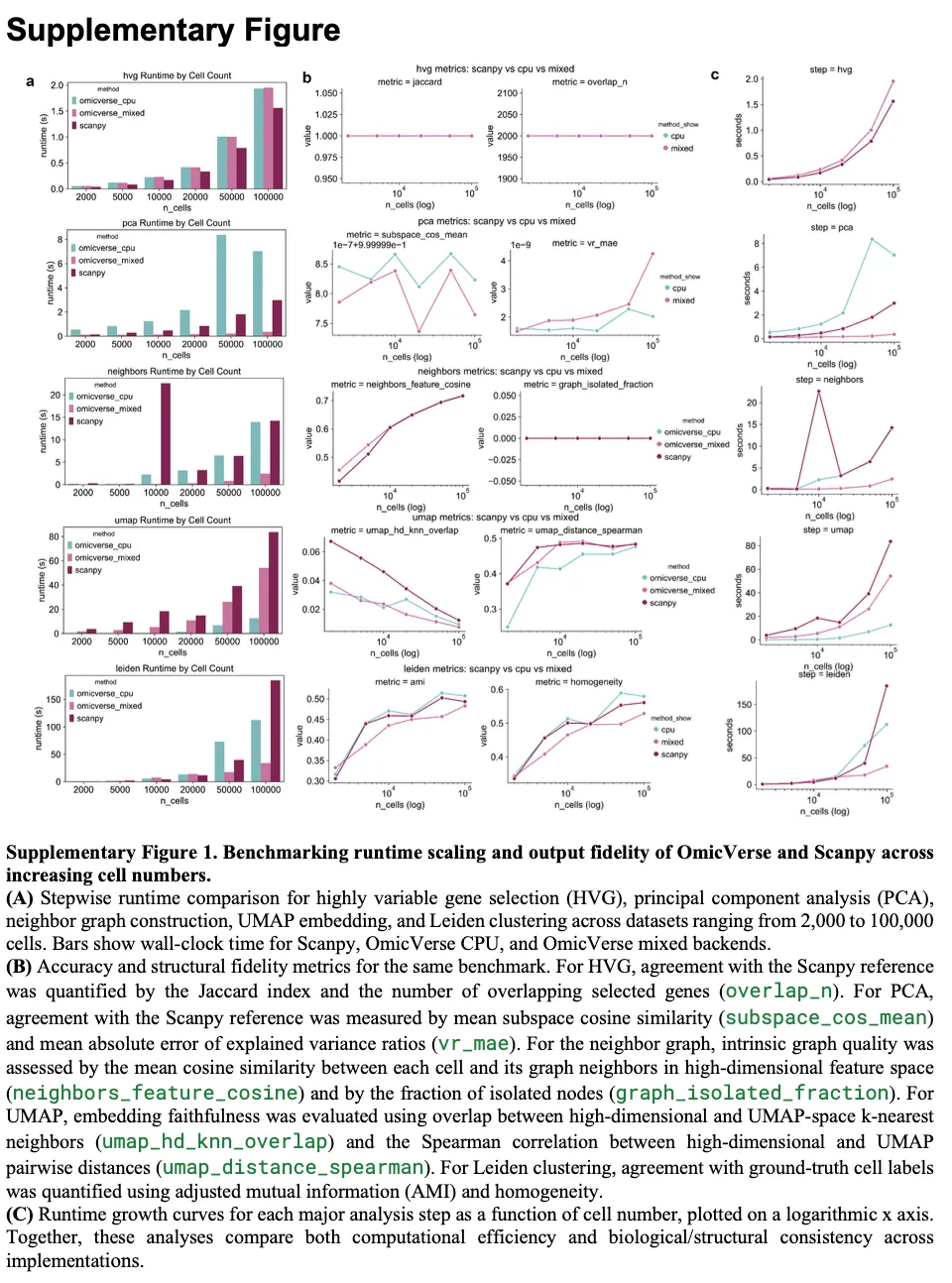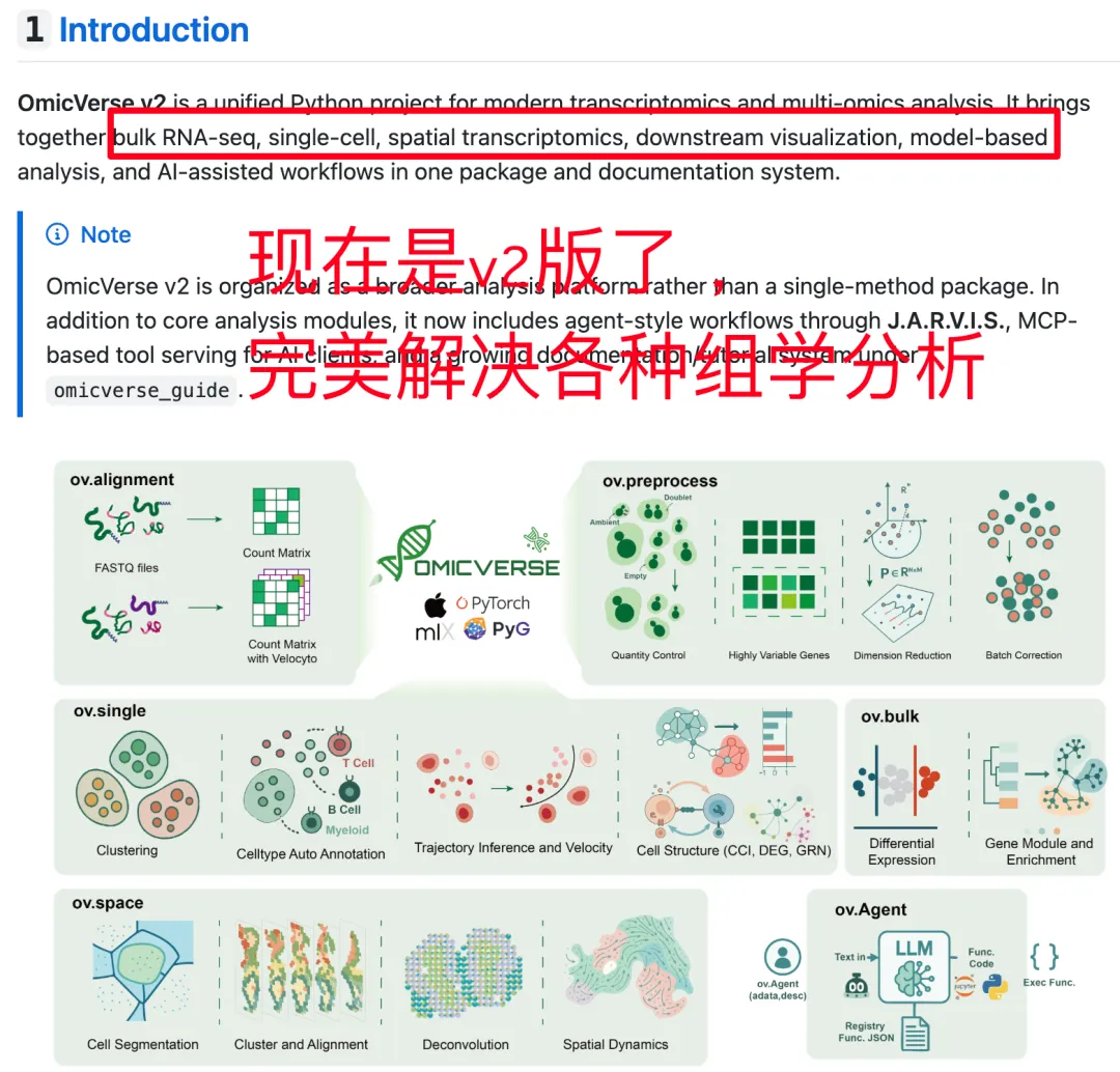 :OmicVerse将上游处理、预处理、单细胞、空间、bulk转录组等不同类型的超过100种分析方法,整合为以AnnData为核心的共享接口,解决了不同工具对象规范不统一、接口不兼容的问题,同时支持CUDA、Apple Metal/MPS等不同加速环境,还将很多原本仅在R中存在的方法重新用Python实现,降低了Python环境用户的使用门槛。