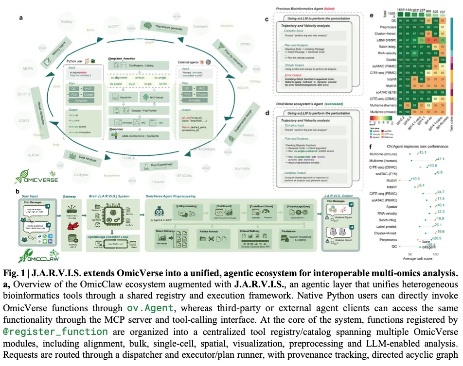 这项研究的核心突破在于提出了一套全新的可执行自然语言多组学分析框架OmicClaw,解决了当前AI辅助多组学分析中代码幻觉、方法选择错误两大核心问题,同时实现了全流程分析的可追溯、可重复。与以往纯大语言模型自由生成代码的AI分析工具不同,OmicClaw将自然语言分析锚定在统一的OmicVerse生态系统中,通过基于注册表的受限运行空间约束大语言模型的行为,避免了无效函数调用、参数误用等常见错误。该框架整合了上游处理、预处理、单细胞、空间、转录组和基础模型等超过100种分析方法,全部统一到以AnnData为核心的共享接口中,同时通过J.A.R.V.I.S.运行层暴露了超过200个注册函数和类,能够验证分析前提、保留分析溯源、支持迭代错误修复。