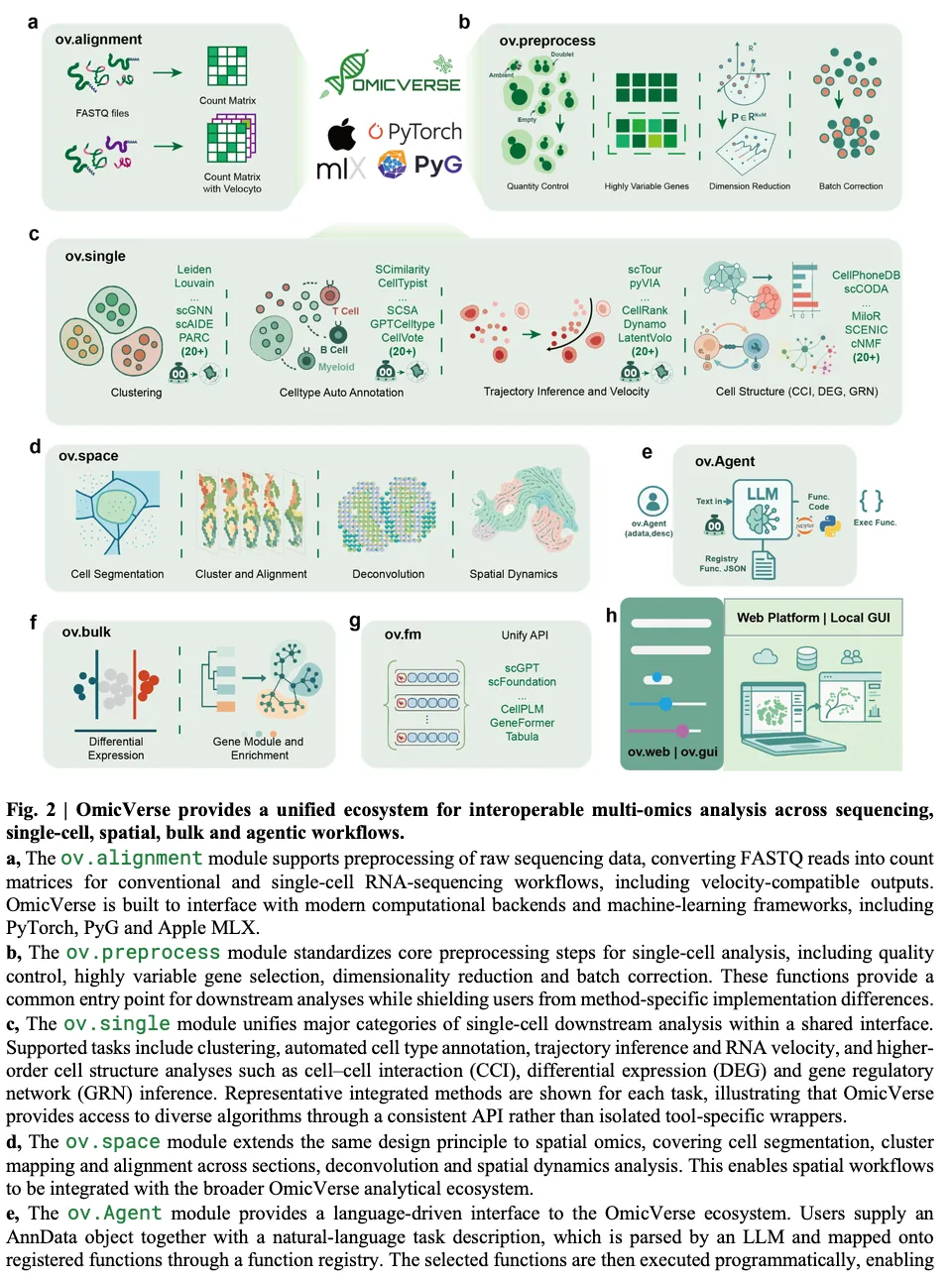 Figure 2:OmicVerse生态的模块结构展示,所有模块统一AnnData接口,覆盖全流程多组学分析需求