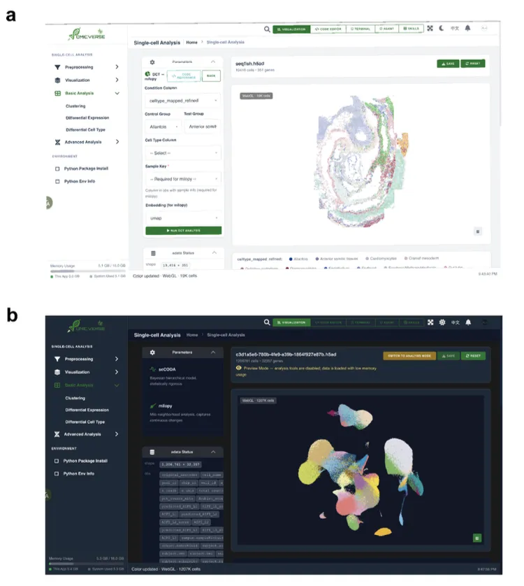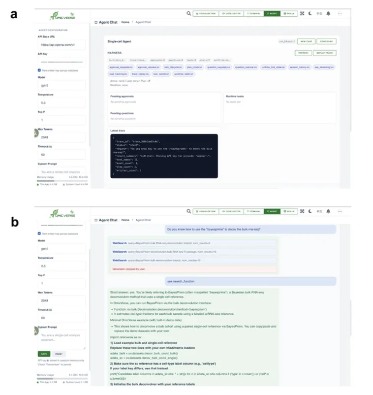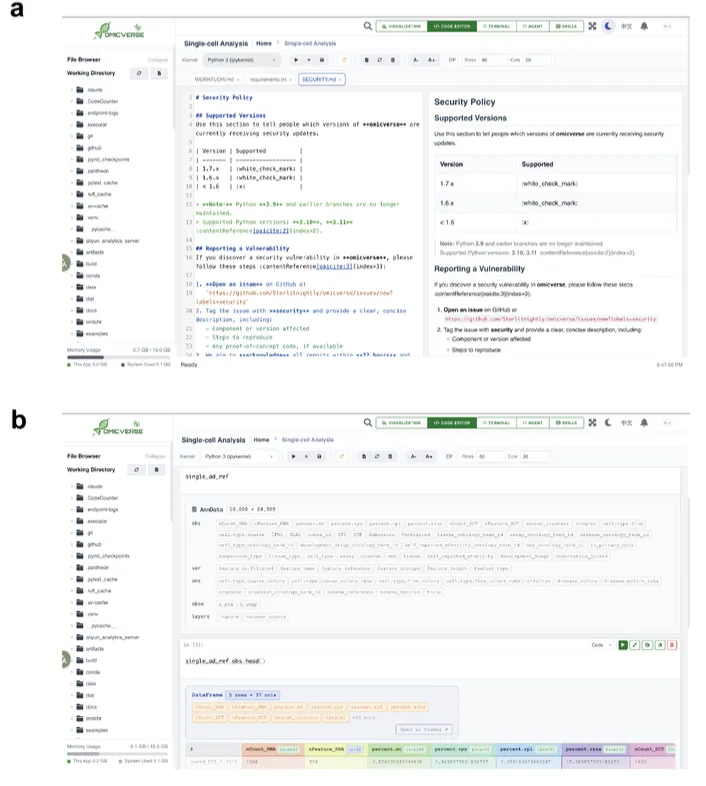 在涵盖scRNA-seq、空间转录组、RNA速度、scATAC-seq、CITE-seq和多组学分析的15个任务基准测试中,基于OmicClaw的ov.Agent比纯一次性大语言模型基线在 rubric评分中表现更优,尤其对于长周期多步工作流的提升更加明显。此外,OmicClaw还支持通过MCP兼容服务器进行外部代理访问,同时提供了对新手友好的网页交互平台,支持交互式分析、代码执行和百万级数据可视化,为现代多组学研究中的可重复人机协作提供了实用基础。
