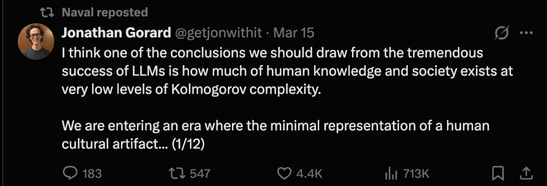 人类知识和社会的很大一部分存在于非常低的 Kolmogorov 复杂度层面。我们正在进入一个时代——最小表征即一切。