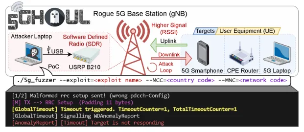5Ghoul 的工作原理基于软件定义无线电(SDR)技术,通过 USRP B210 硬件设备模拟 rogue 基站(gNB),与目标用户设备(UE)建立连接,然后发送精心构造的恶意协议数据单元(PDU),触发目标设备协议栈中的漏洞。
