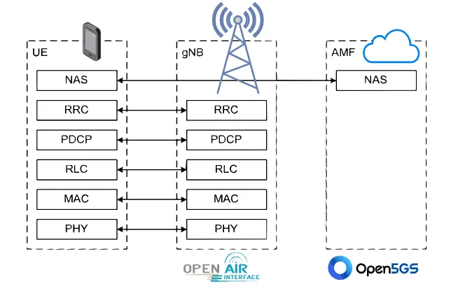 核心网络层:集成 Open5GS 开源 5G 核心网,处理 NAS、IPv4 等高层协议,管理用户认证和会话建立。