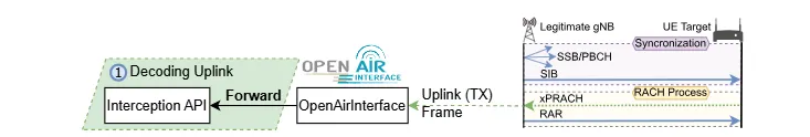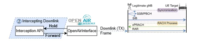 下行数据包的拦截则采用”保持”(Hold)操作机制。基站生成的原始 5G MAC 缓冲区在发送前会被传递给用户的 C++ 攻击脚本,允许在数据包发送前进行修改。任何对数据包缓冲区的更改都会被转发回基站软件栈,最终通过空中接口发送给目标设备。