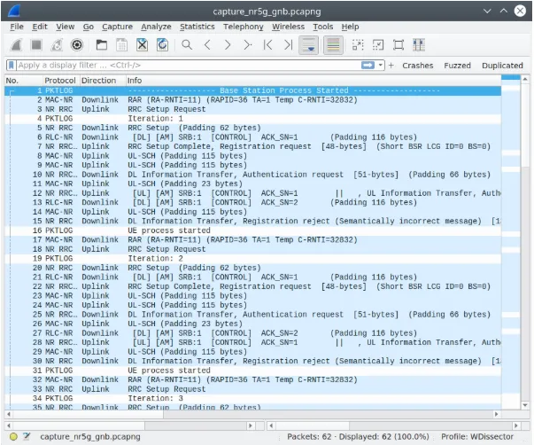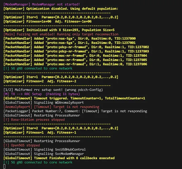 成功连接智能手机或调制解调器后,5G 模糊测试器会以紫色高亮显示被变异(模糊)的下行 PDU。同时,向用户展示智能手机(UE)与执行模糊测试的 rogue 基站(gNB)之间空中通信的实时捕获。通信跟踪和日志保存到 logs/5gnr_gnb 目录。