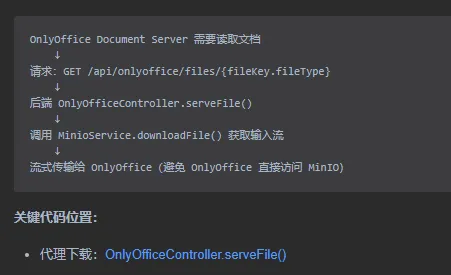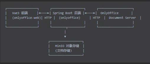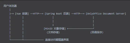 这是一个基于 OnlyOffice Document Server 和 MinIO 对象存储 的在线文档协作系统。用户可以通过 Web 界面上传、预览、编辑 Office 文档(Word、Excel、PowerPoint 等),所有文档存储在 MinIO 中,通过 OnlyOffice 实现在线协作编辑功能。