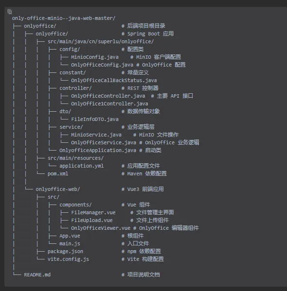 今天,我将带你深入剖析一个基于 OnlyOffice Document Server + MinIO 对象存储 的在线文档协作系统。项目采用 Vue3 + Spring Boot 前后端分离架构,实现了文档上传、在线预览/编辑、自动保存、文件管理等一系列功能,并且通过 JWT 令牌保证了回调接口的安全性。