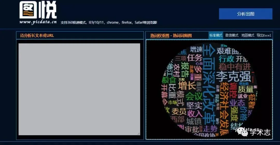 图悦是一款在线的热词分析工具,它可以对于载入文本或指向文本内容的链接进行词频提取和词语(重要性)权重分析,并可以导出成excel格式的文件,便于后期分析和处理。