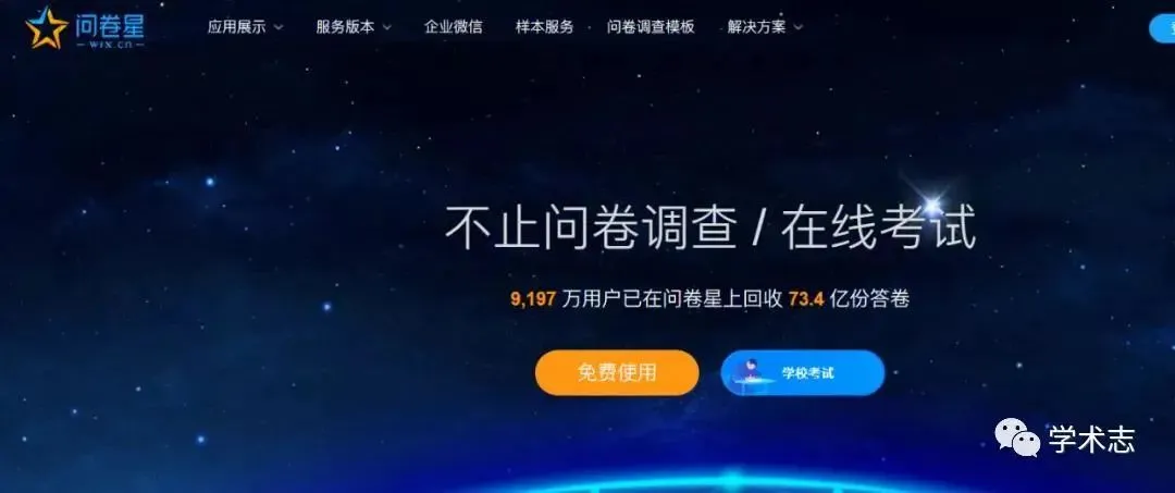 问卷星是一个专业的在线问卷调查、测评、投票平台,专注于为用户提供功能强大、人性化的在线设计问卷、采集数据、自定义报表、调查结果分析系列服务。与传统调查方式和其它调查网站或调查系统相比,问卷星具有快捷、易用、低成本的明显优势,已经被大量企业和个人广泛使用。