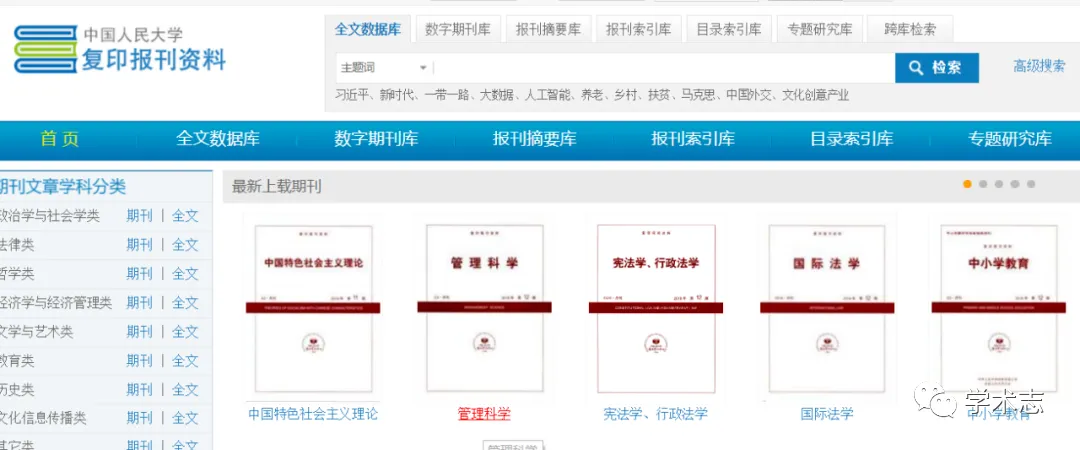 中国人民大学复印报刊资料库,简称“人大复印库”,是人大数媒科技(北京)有限公司以人民大学书报资料中心的复印报刊资料系列数据库为内容基础,辅以检索功能、期刊、论文推荐而成的人文科学、社会科学资料库。