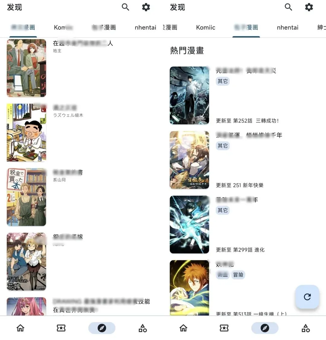 添加上漫画源以后点击下方的发现按钮就会显示添加的源的漫画了。