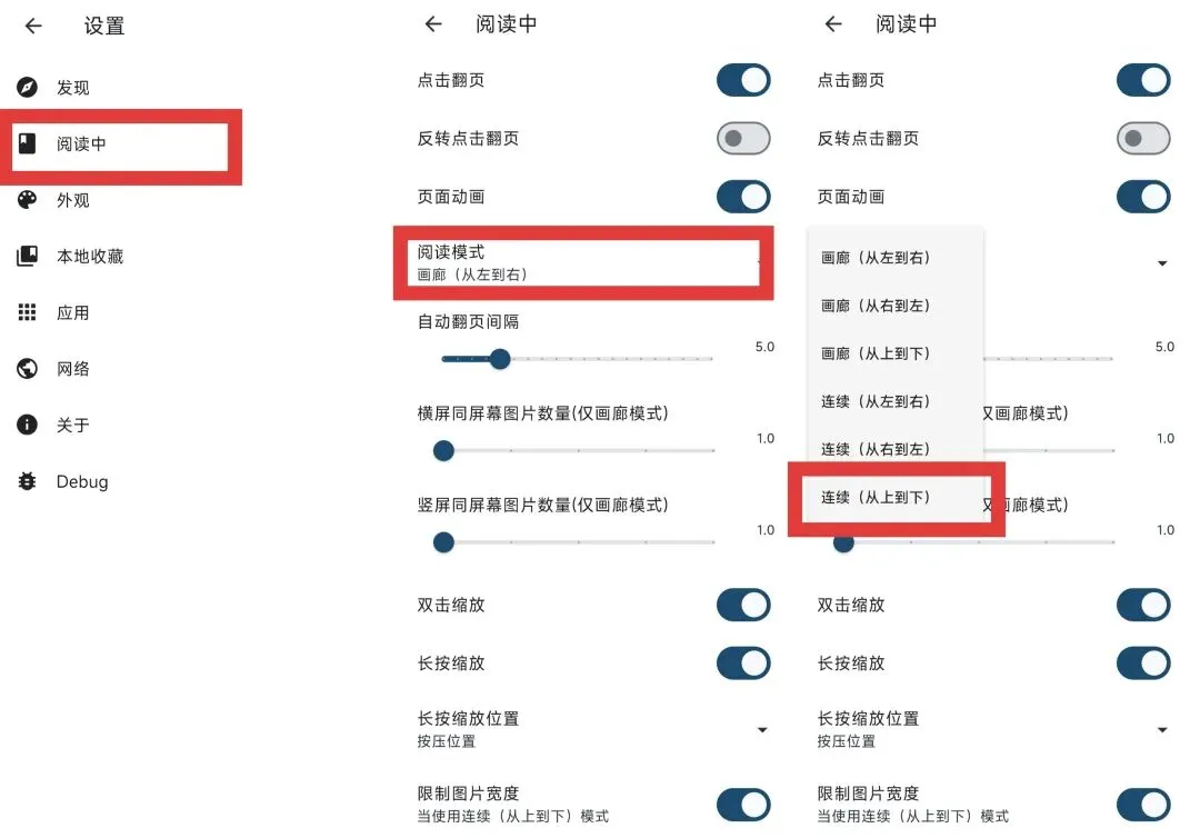 先点击主页右上角的设置图标找到阅读中再点击阅读模式选择连续(从上到下)即可