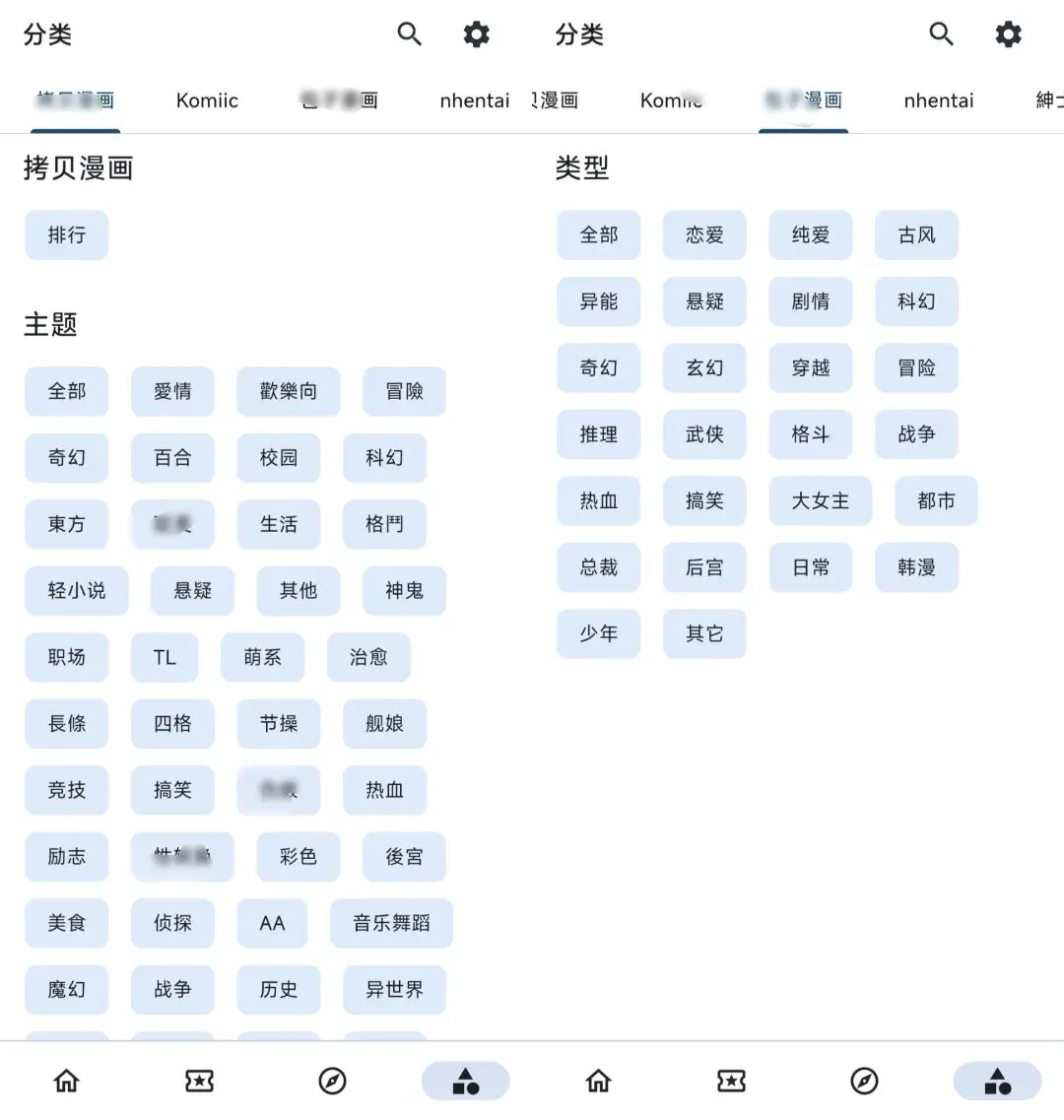 如果想看某种类型的动漫,我们可以点击底部的分类按钮,这里是对漫画的详细分类,使用起来很方便。