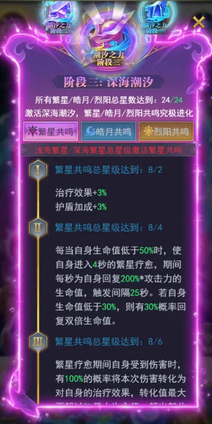 3、所有繁星/皓月/烈阳神源星级总和达到24星后,浅海潮汐之力进化为深海潮汐之力。