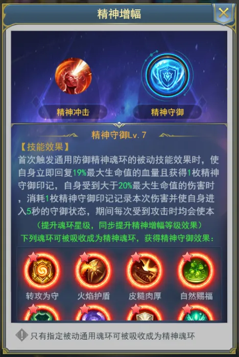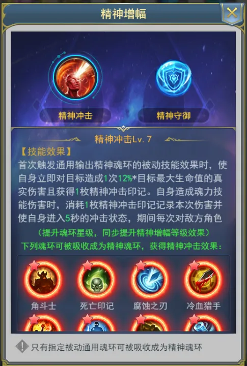 3、根据被动魂环种类不同(输出/生存)附加不同精神增幅效果(精神冲击/精神守御)。