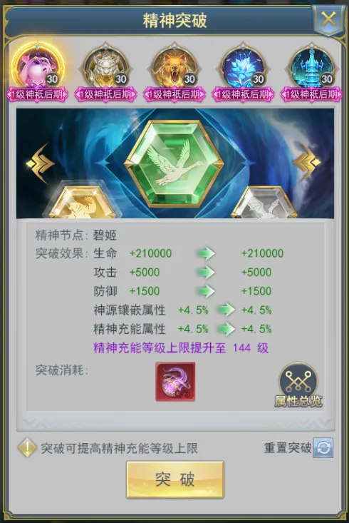 3、突破后可无损重置,取消突破的所有效果同时返还消耗的神源精魄。