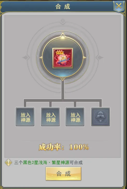1、可以消耗3个相同类型的黑色2星神源,合成出红色3星神源。