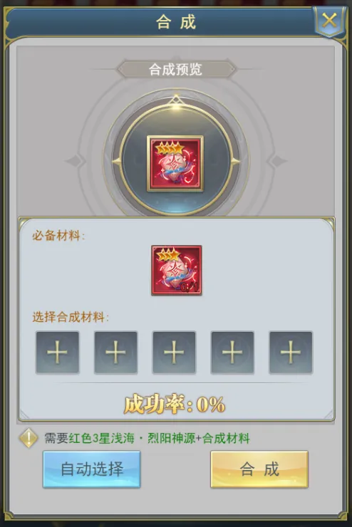 2、可以使用红色3星神源和合成材料,概率合成出红色4星神源。